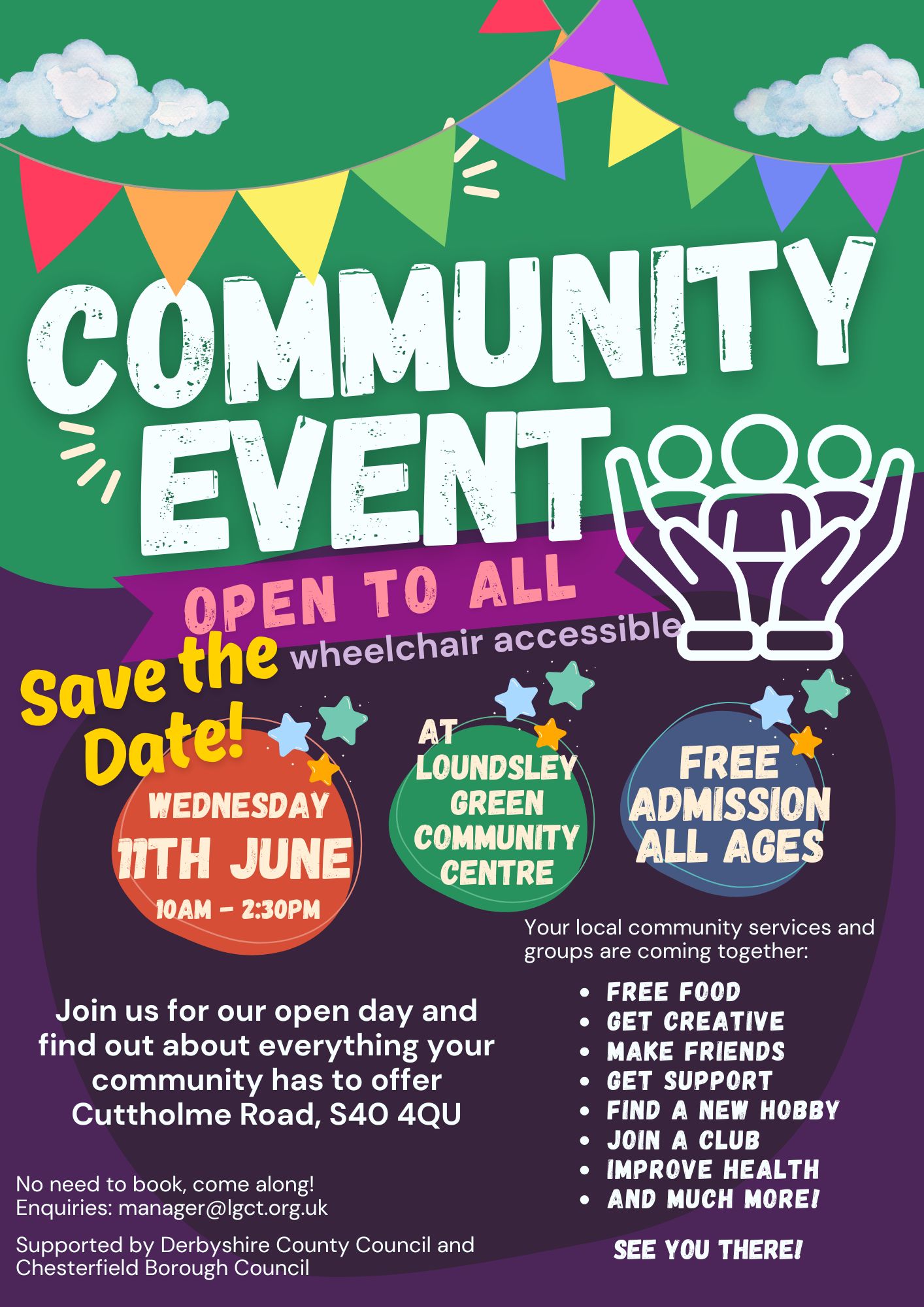 This exciting event is a collaboration between Chesterfield Foodbank, Derbyshire County Council, Chesterfield Borough Council, and the Loundsley Green Community Trust — all coming together to create a day full of support, community connection, and practical help.