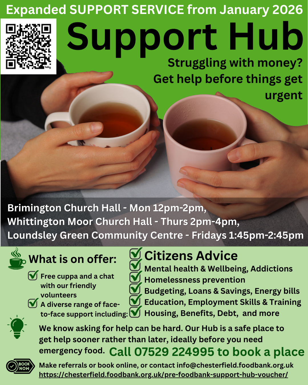 We aim to help people get support and advice early, to help prevent the need for emergency food. Find out more below. You can book a ticket (a Support Hub Voucher) by using the green button.
