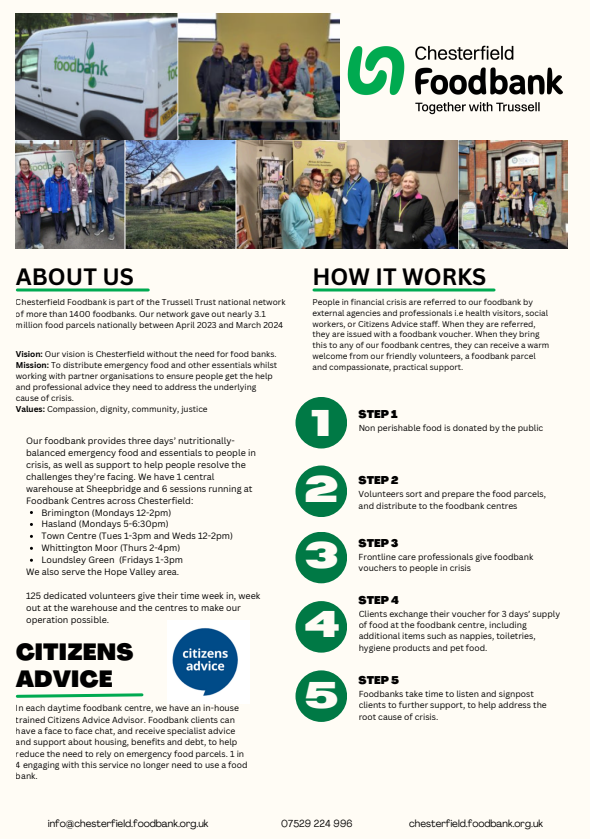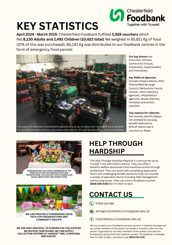 Chesterfield Foodbank is a registered charity that was started in June 2013. It is a franchisee of the Trussell Trust, (1400 foodbanks across the UK) and provides emergency food packs for people in financial crisis. The foodbank operates six foodbank sessions at Brimington, Hasland, West Bars, Whittington Moor and Loundsley Green. We also serve the Hope Valley area. We have a warehouse at Sheepbridge and 2 vans.