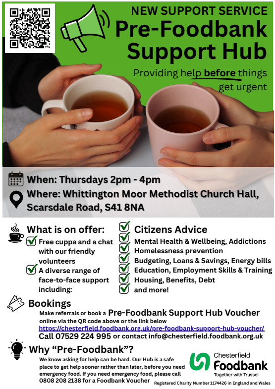 Our Pre-Foodbank Support Hub is on Thursdays between 2pm and 4pm at Whittington Moor Methodist Church Hall.